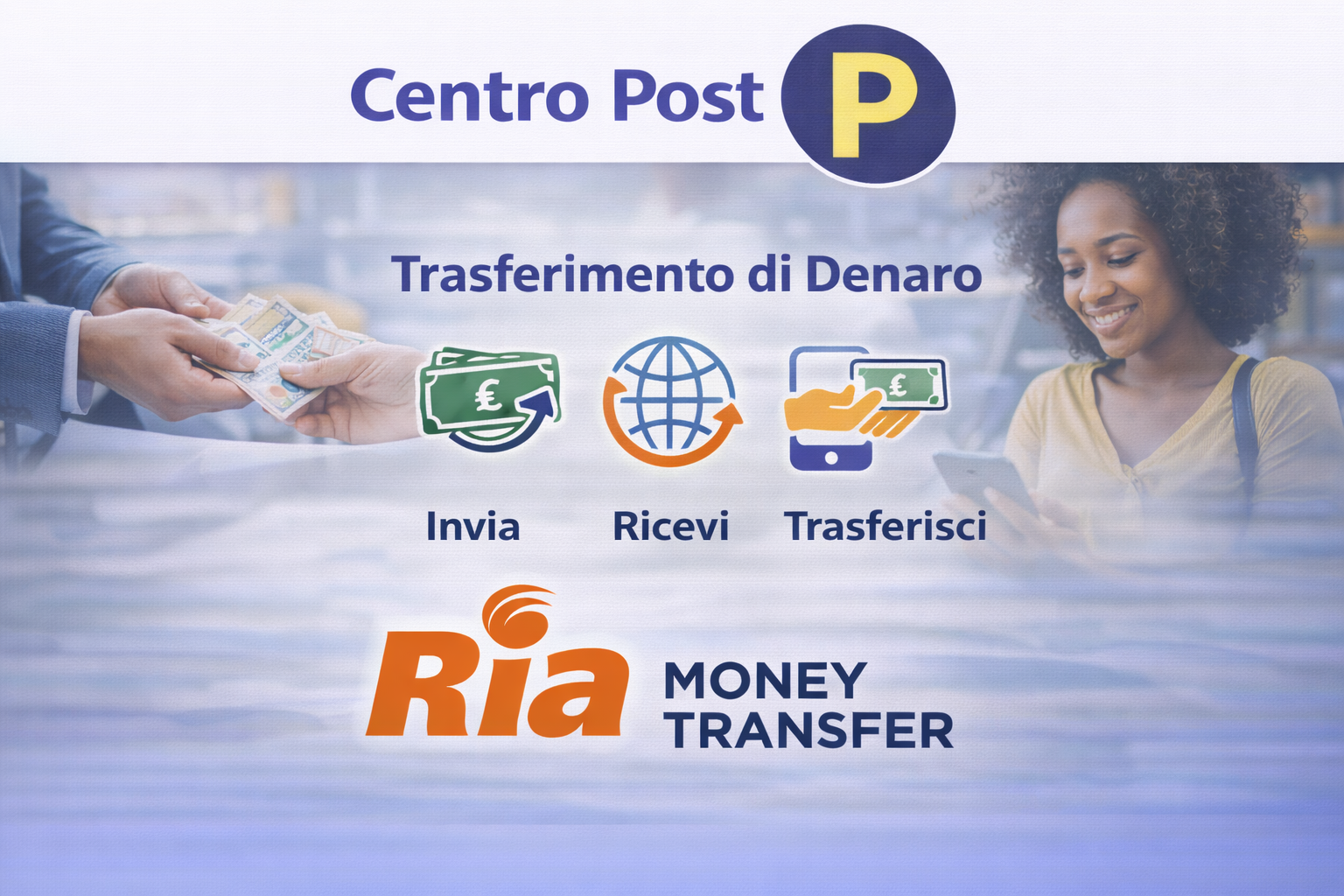 Nelle nostre agenzie è attivo il servizio di trasferimento di denaro. Se hai necessità di inviare soldi ad un tuo amico o parente, non esitare a contattarci. Ti assicuriamo grazie al circuito RIA MONEY TRANSFER, commissioni agevolate ed un servizio celere ed efficace.